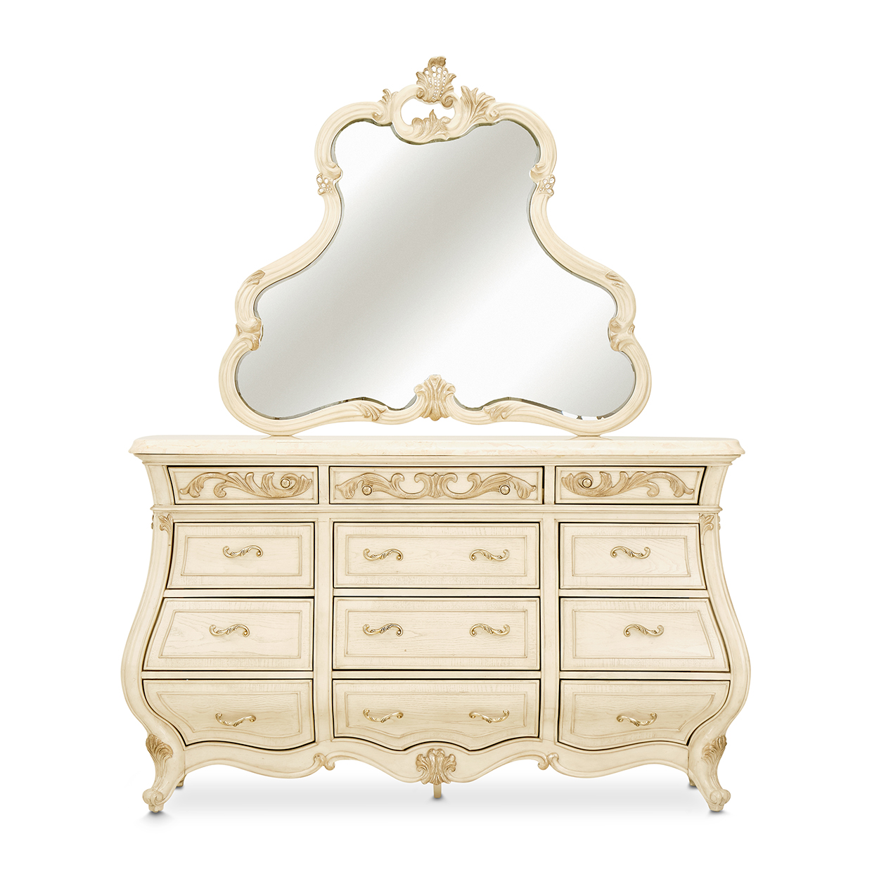 An embodiment of regal romance, the Platine de Royale Dresser & Mirror Set brings timeless European artistry to the bedroom. The dresser’s grand bombe silhouette, crafted from poplar solids and ash veneers in a soft champagne finish, evokes the elegance of a Parisian estate. Intricate scrollwork, hand-finished in antique platinum leaf, adorns the upper drawers, while a creamy marble top adds a layer of richness. Paired with a gracefully contoured mirror crowned in elaborate carvings, this duo reflects a refined glamour that feels both classic and couture. Velvet- and cedar-lined drawers, soft-close glides, and a hidden jewelry tray complete the experience with practical indulgence.