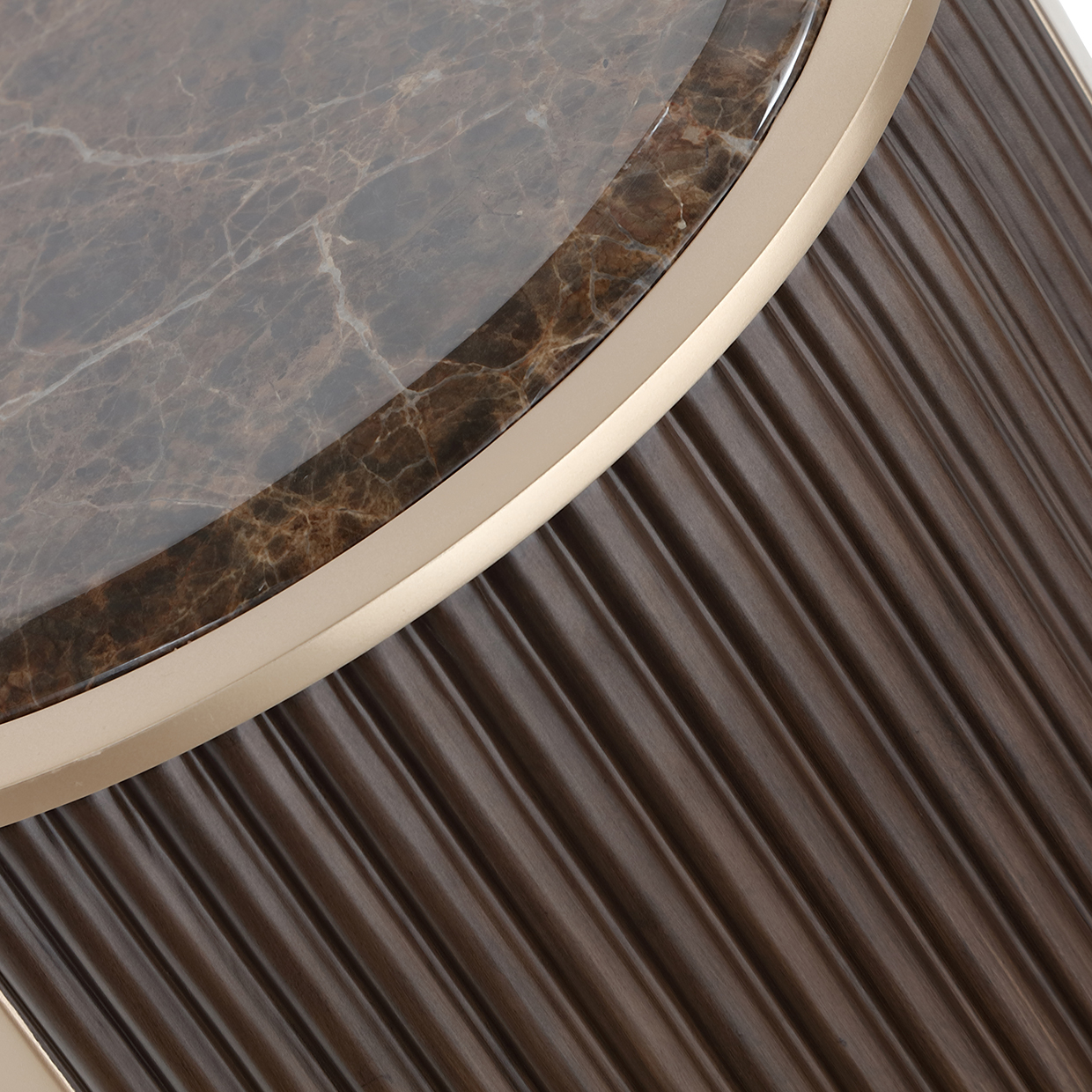 The West Kensington Chairside Table is a striking blend of modern sophistication and timeless elegance. Wrapped in a rich espresso finish with intricate reeding, this table captivates with its sculptural presence. A sumptuous Emperador marble veneer top adds a refined contrast, framed by elegant gold accents for a touch of glamour. Perfect for pairing with your favorite chair or sofa, this piece enhances any space with its sleek silhouette and opulent materials.