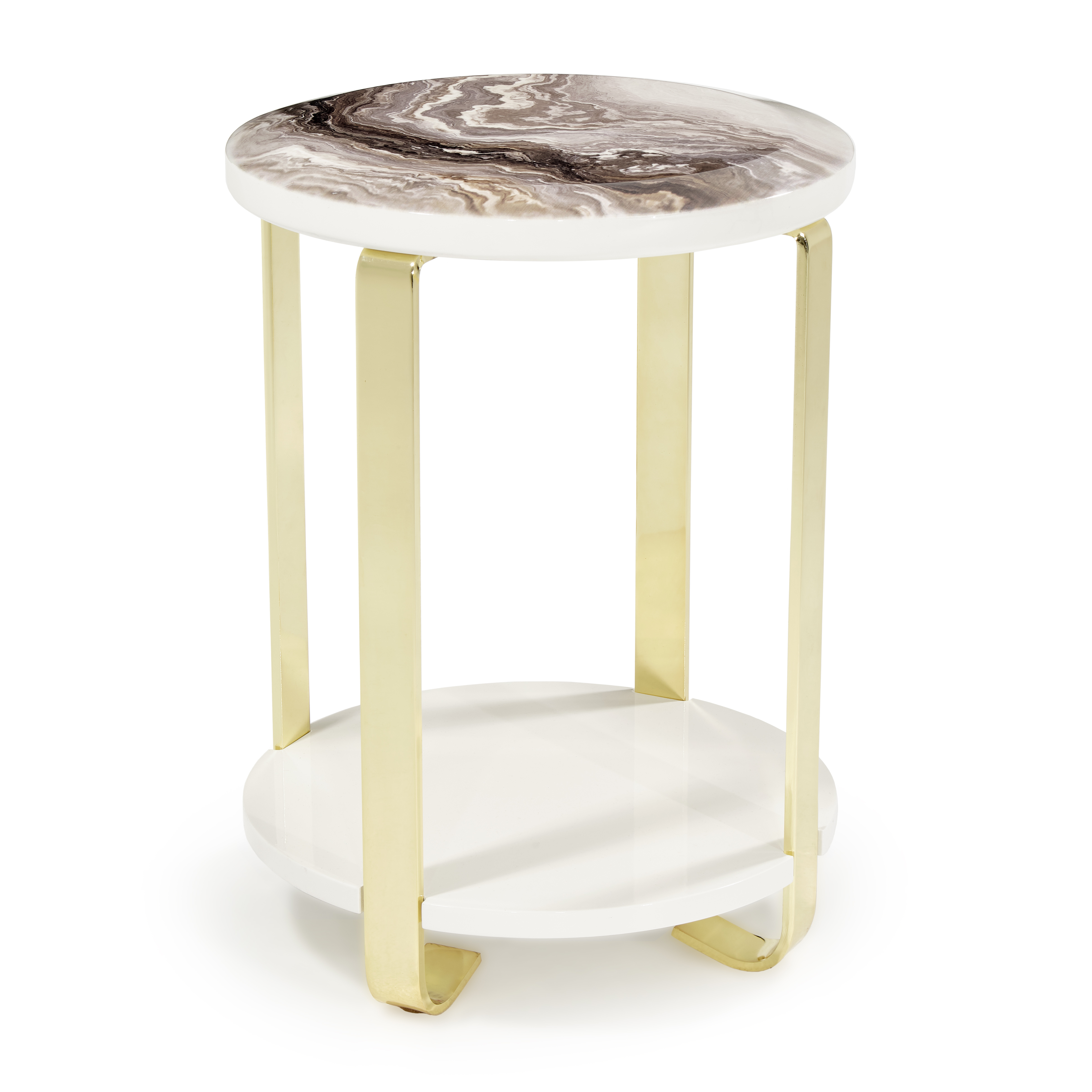 Petite in scale yet grand in presence, the Ariana Chairside Table is a jewel of modern refinement. Its marbleized top, swirling with beige, taupe, and caramel tones, evokes the beauty of polished stone kissed by light. Resting on sleek gold-finished legs and a glossy white base, this compact piece brings luminosity and balance to any corner—ideal beside a chair, sofa, or as a standalone accent of quiet glamour.