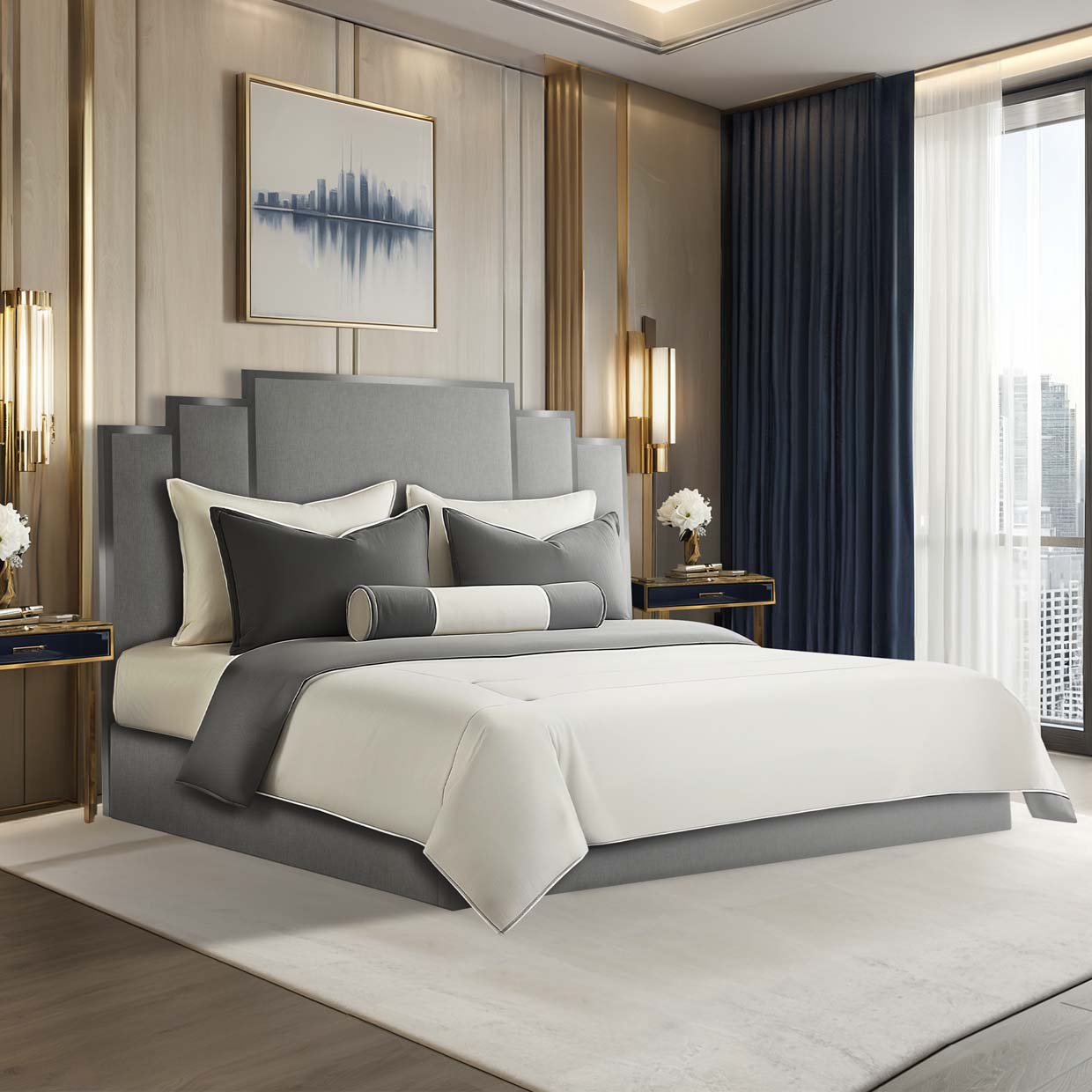 • Headboard with Chrome Accents: Features a stepped silhouette with vertical paneling, framed in sleek chrome metal for a subtle touch of modern glamour.