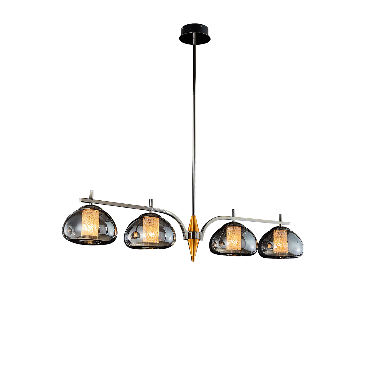 With a sleek, linear silhouette and warm layered glow, the Ember 4-Light Rectangular Chandelier brings contemporary drama to dining and entertaining spaces. Four smoky glass domes are symmetrically arranged along a sweeping metal frame, anchored by a central golden finial for a touch of vintage flair. Inside each shade, a hand-textured amber diffuser radiates ambient light, glowing through soft curves and prismatic surfaces. The chandelier’s clean geometry and rich contrast of tones offer refined sophistication in kitchens, dining rooms, and beyond.