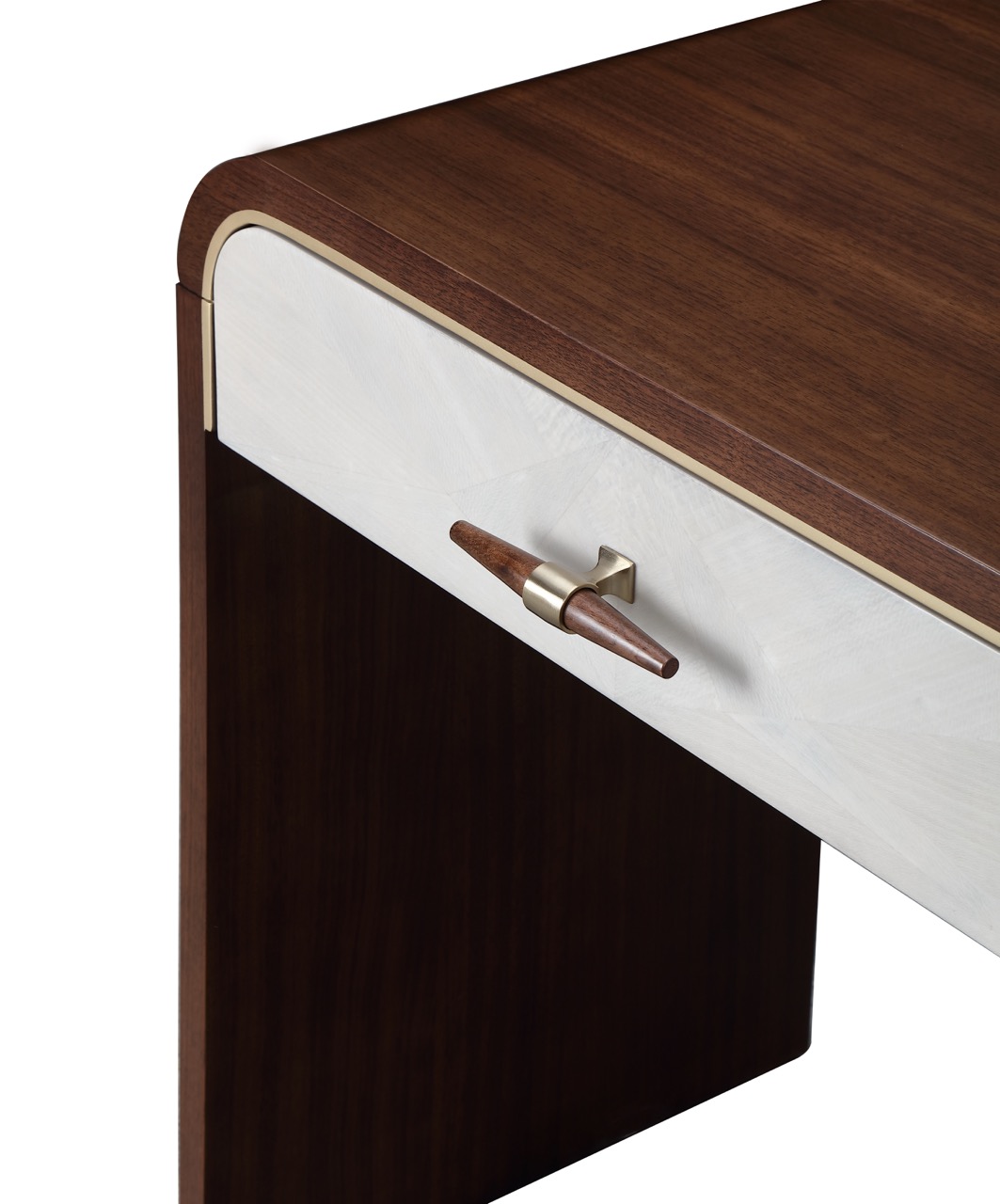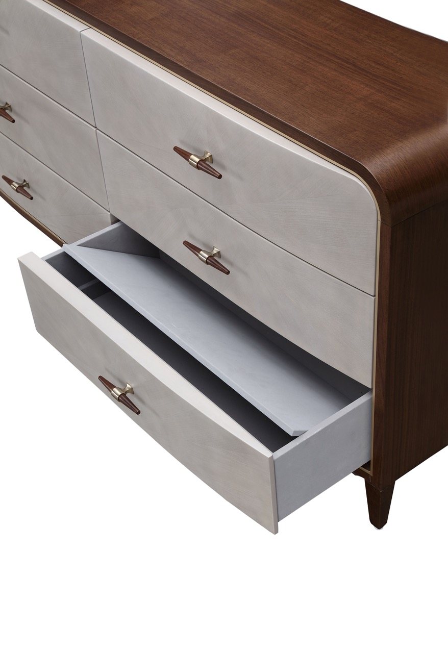 The Houston Collection brings contemporary sophistication with a relaxed aesthetic, designed for those who appreciate understated luxury. Crafted in a warm walnut finish, each piece is accented with contrasting gray drawer and door fronts, highlighted by refined gold details. In the bedroom and dining spaces, plush mushroom gray velvet upholstery offers a soft and inviting feel, while the living room pieces feature a mingled bouclé fabric in a rich blend of gray, ivory, and taupe—adding depth and texture to every space.