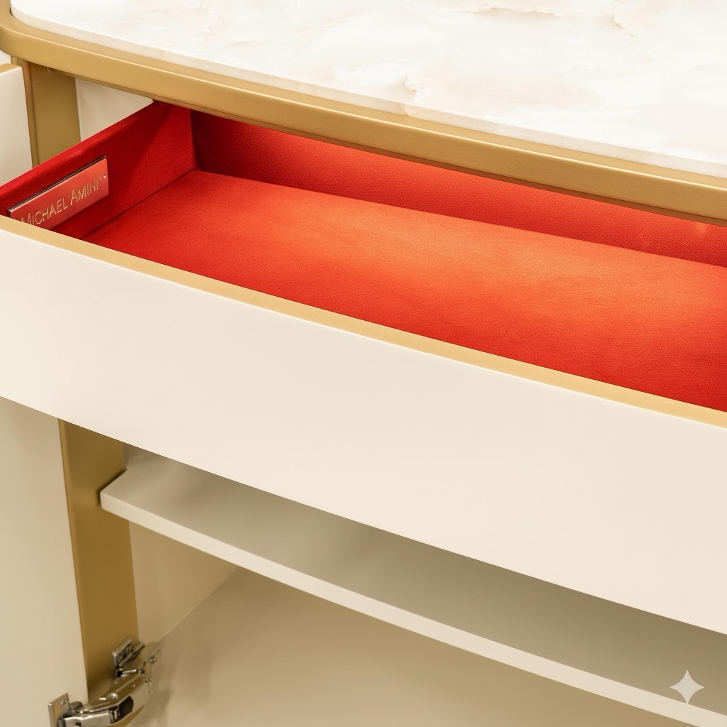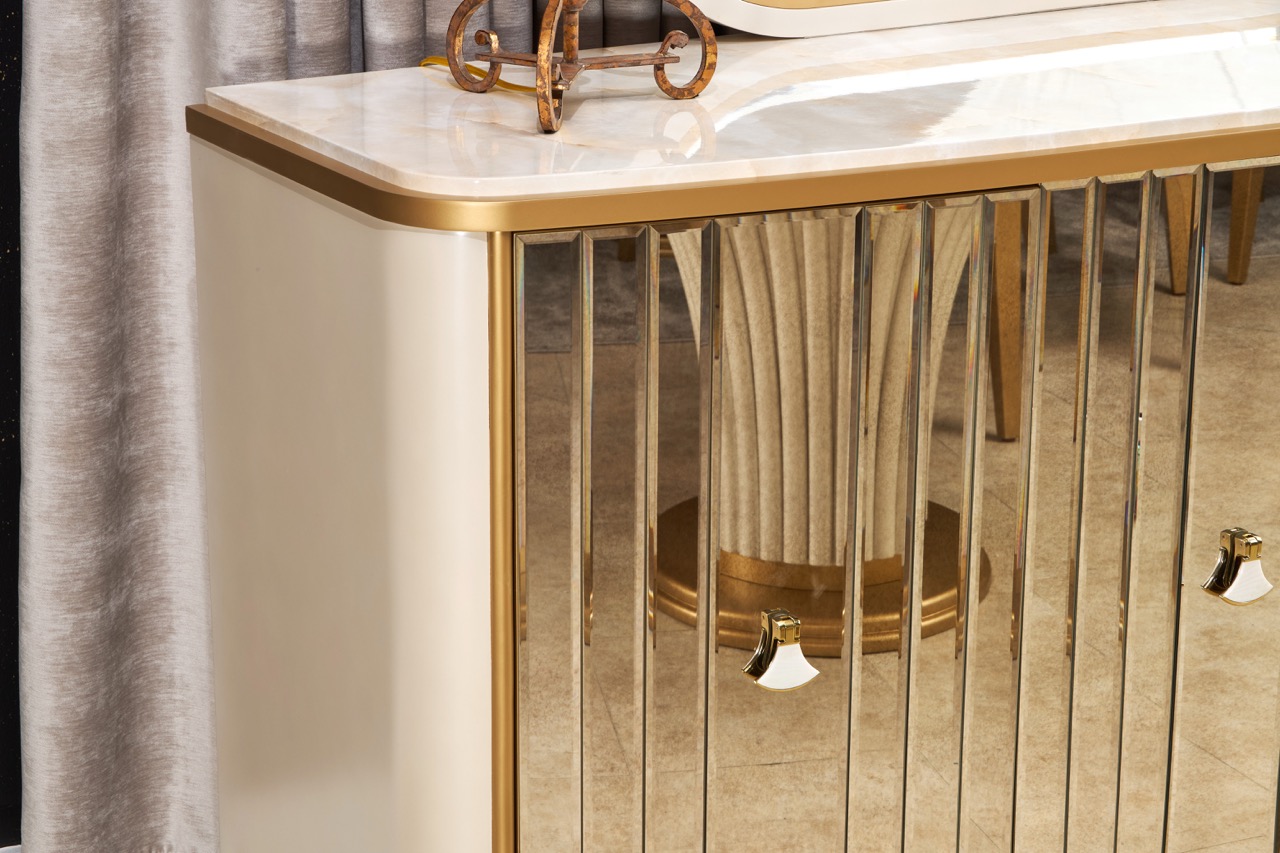 Step into a world of luminous beauty with Scotts Square, where every detail whispers romance and every surface captures the light. Softly curved silhouettes in a light champagne finish are kissed with gold, framing beveled antique mirrors that shimmer with timeless allure. Sculptural hardware, adorned with luminous mother-of-pearl, lends a jeweled touch to each piece. Wrapped in plush chenille upholstery, each seat invites you to linger, blending elegance and comfort into anirresistible embrace.