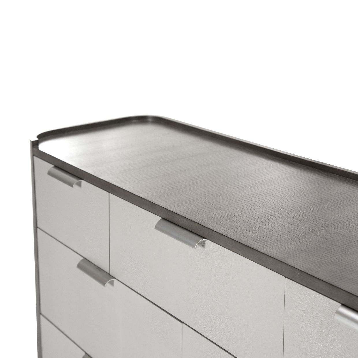 • Couture-Inspired Faux-Shagreen Fronts: Frost gray faux-shagreen drawer fronts introduce a refined texture, offering a subtle contrast that elevates the dresser’s modern appeal.