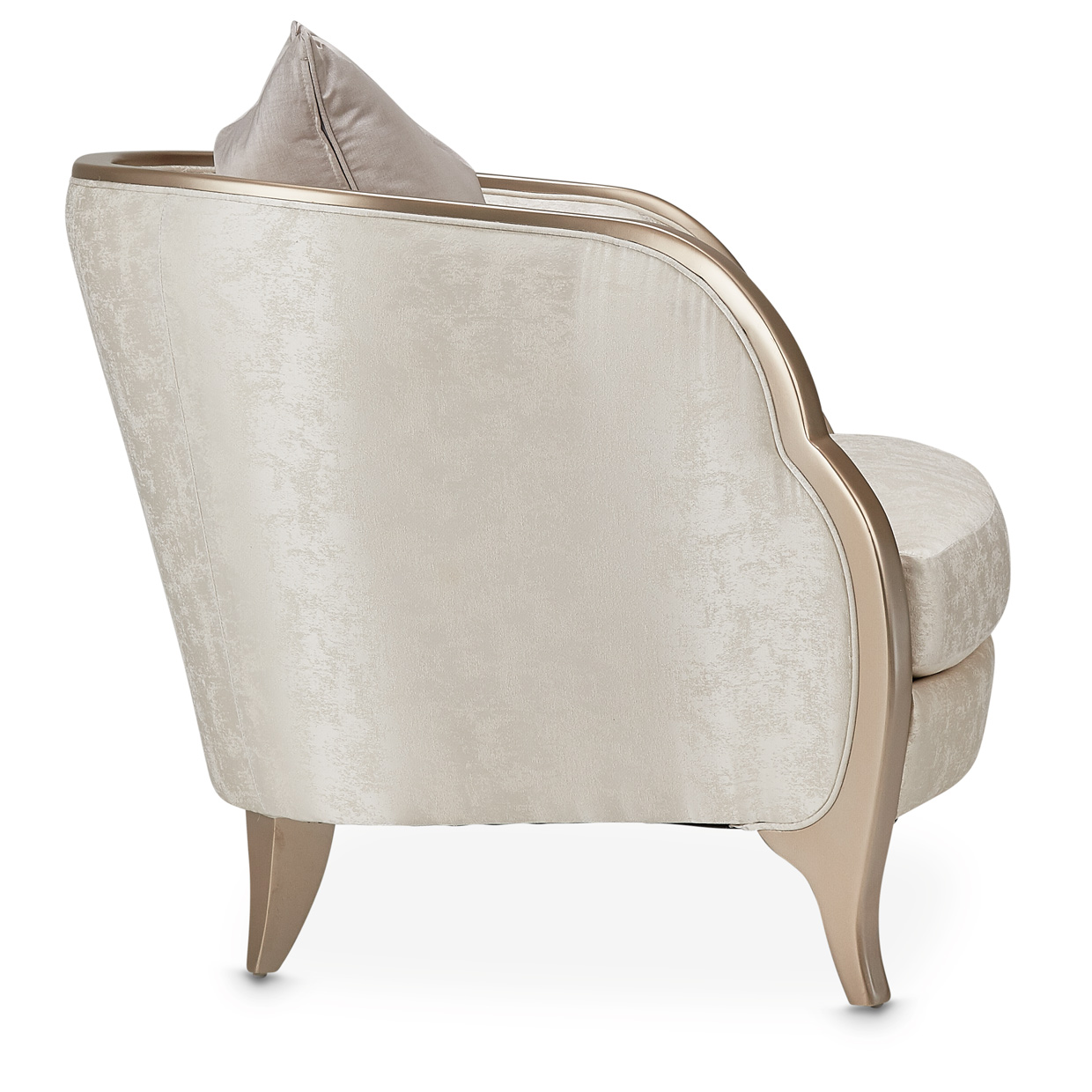 Indulge your elegance with the Malibu Crest Chair! This design features a beautifully shaped body with dramatic flared sides. Upholstered in a classy marbled jacquard in Cloud White and framed in Chardonnay finished hardwood, this chair makes it easy to make a classy statement.