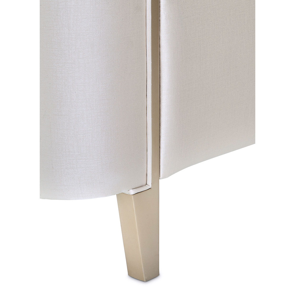 • Headboard, side panels, and footboard are upholstered in faux silk in a Porcelain color