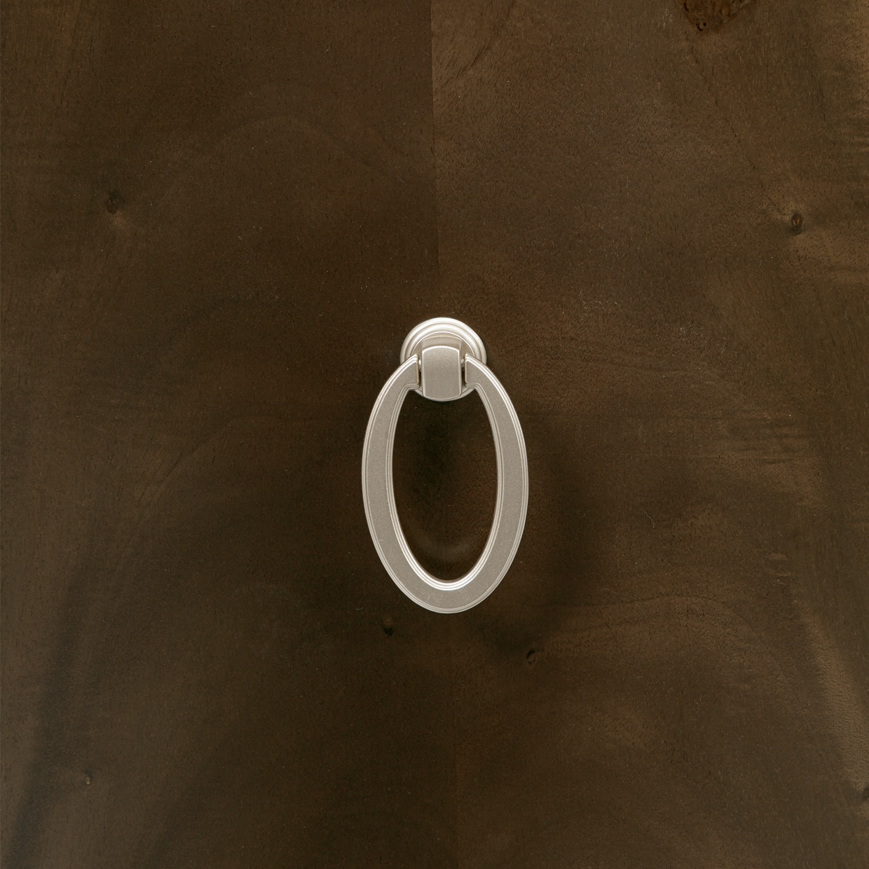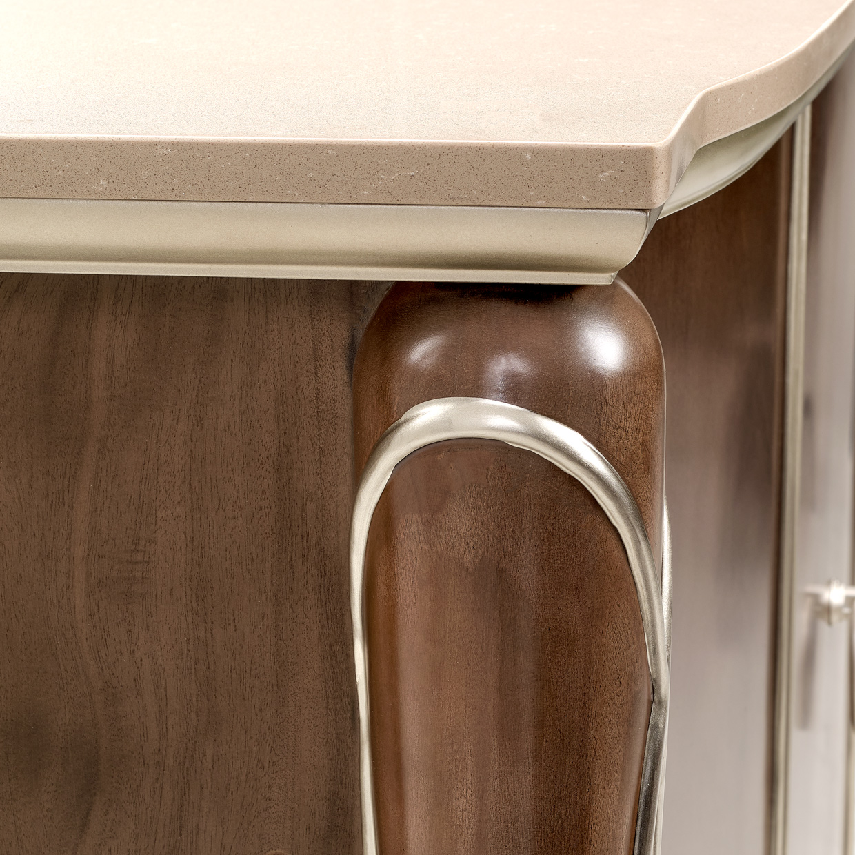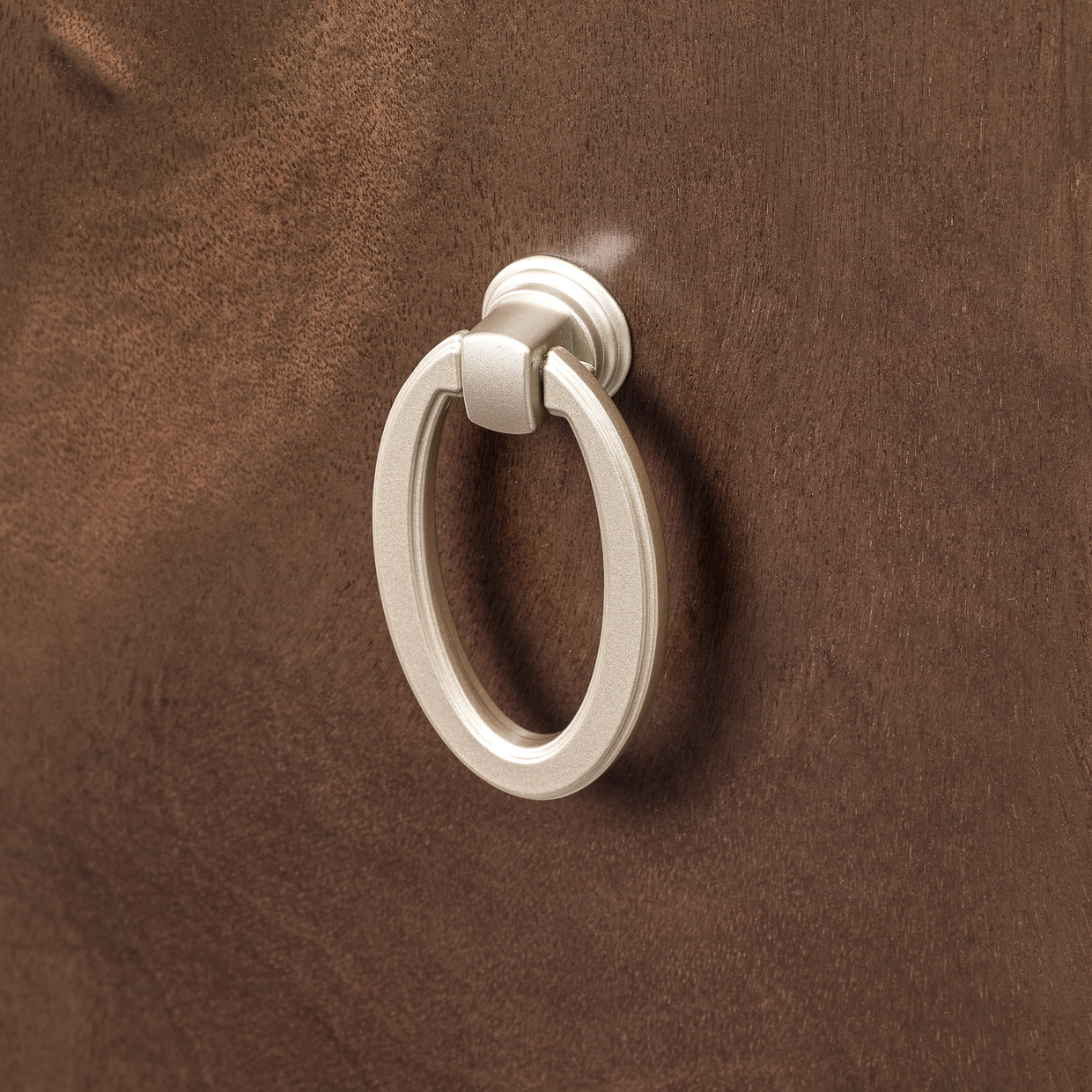 • Hoop cabinet pulls, leg accents, feet, and stretcher are finished in Chardonnay