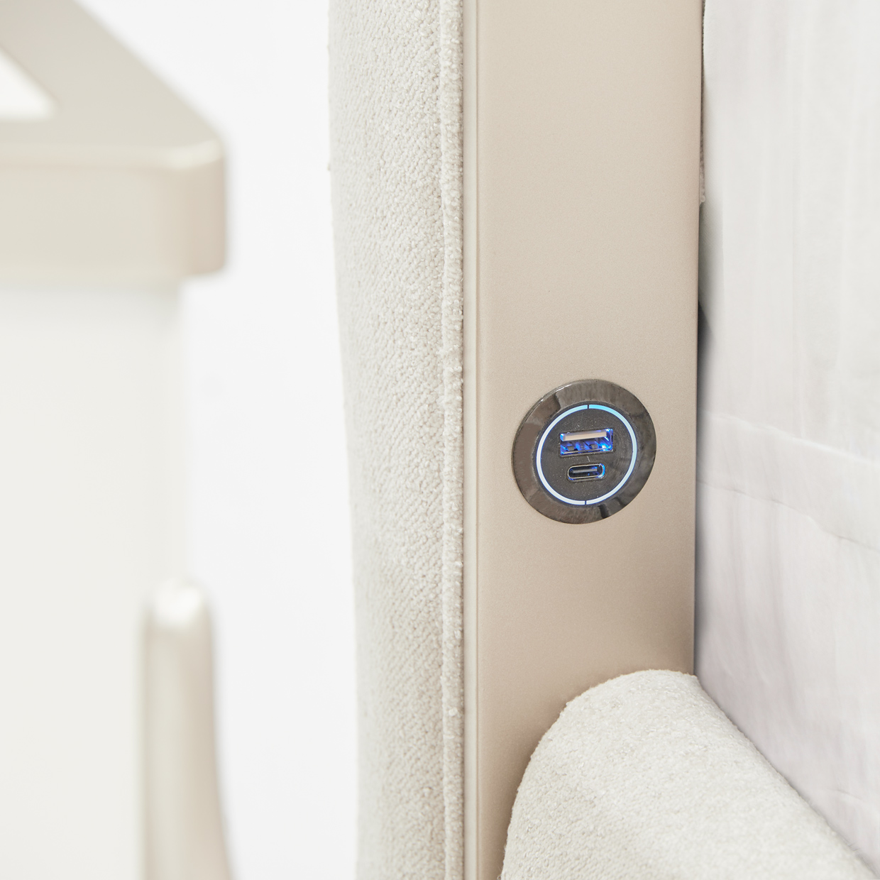 Elegance meets modern functionality in the La Marisia Upholstered Bed. Wrapped in a plush cream chenille, the sculpted headboard features a subtle, fan-like silhouette, accentuated by champagne-finished trim. Designed for convenience, the bed includes discreet USB-C and USB-A ports on both sides, ensuring your devices stay charged while you unwind. Built for versatility, this piece is compatible with an adjustable base, blending luxury with practicality.