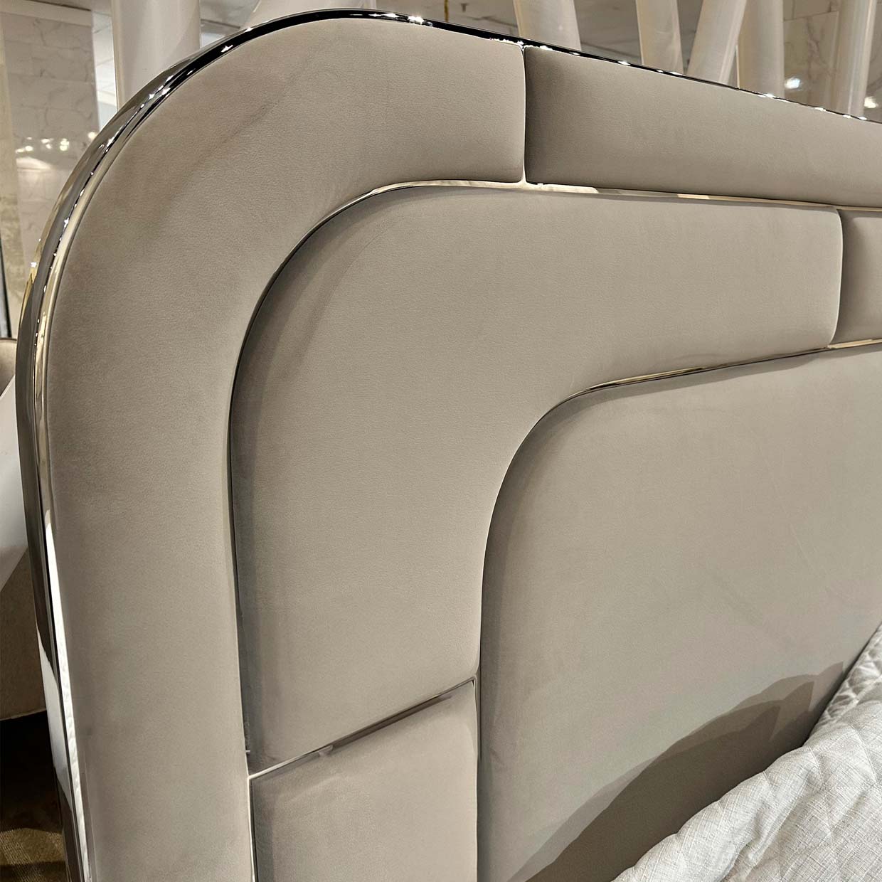 • Plush Velvet Elegance: Upholstered in a refined gray velvet, the bed is elevated by sleek metal trims that highlight the headboard’s tailored paneling.