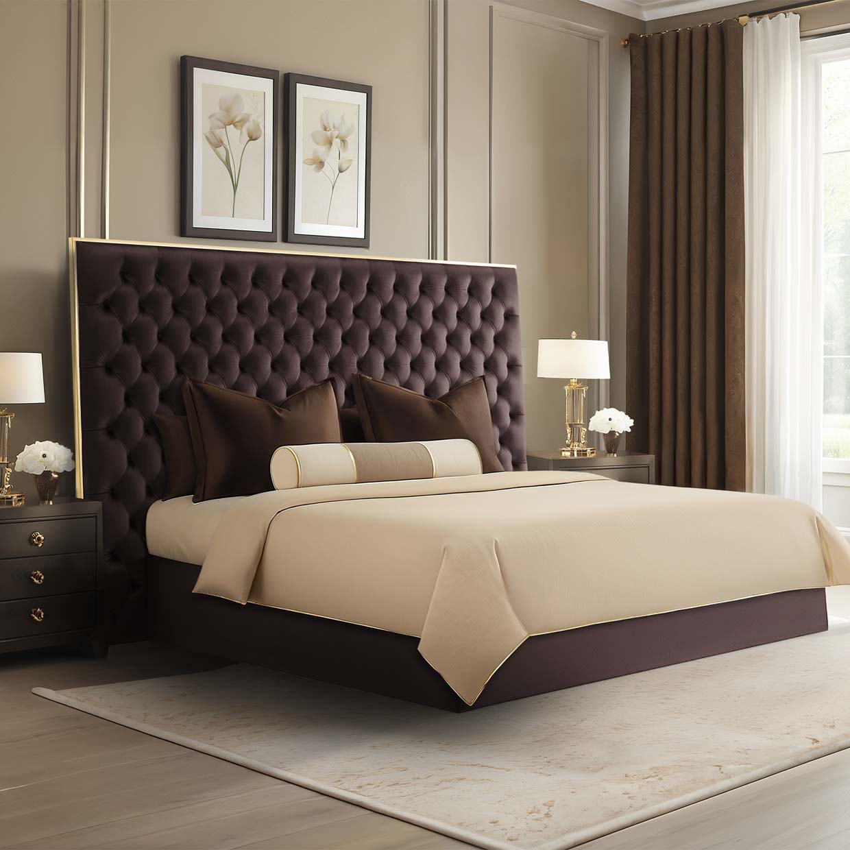 • Grand Button-Tufted Headboard: Nearly 6 feet tall, this statement headboard is wrapped in luxurious chocolate brown velvet and finished with classic button tufting, radiating timeless sophistication.