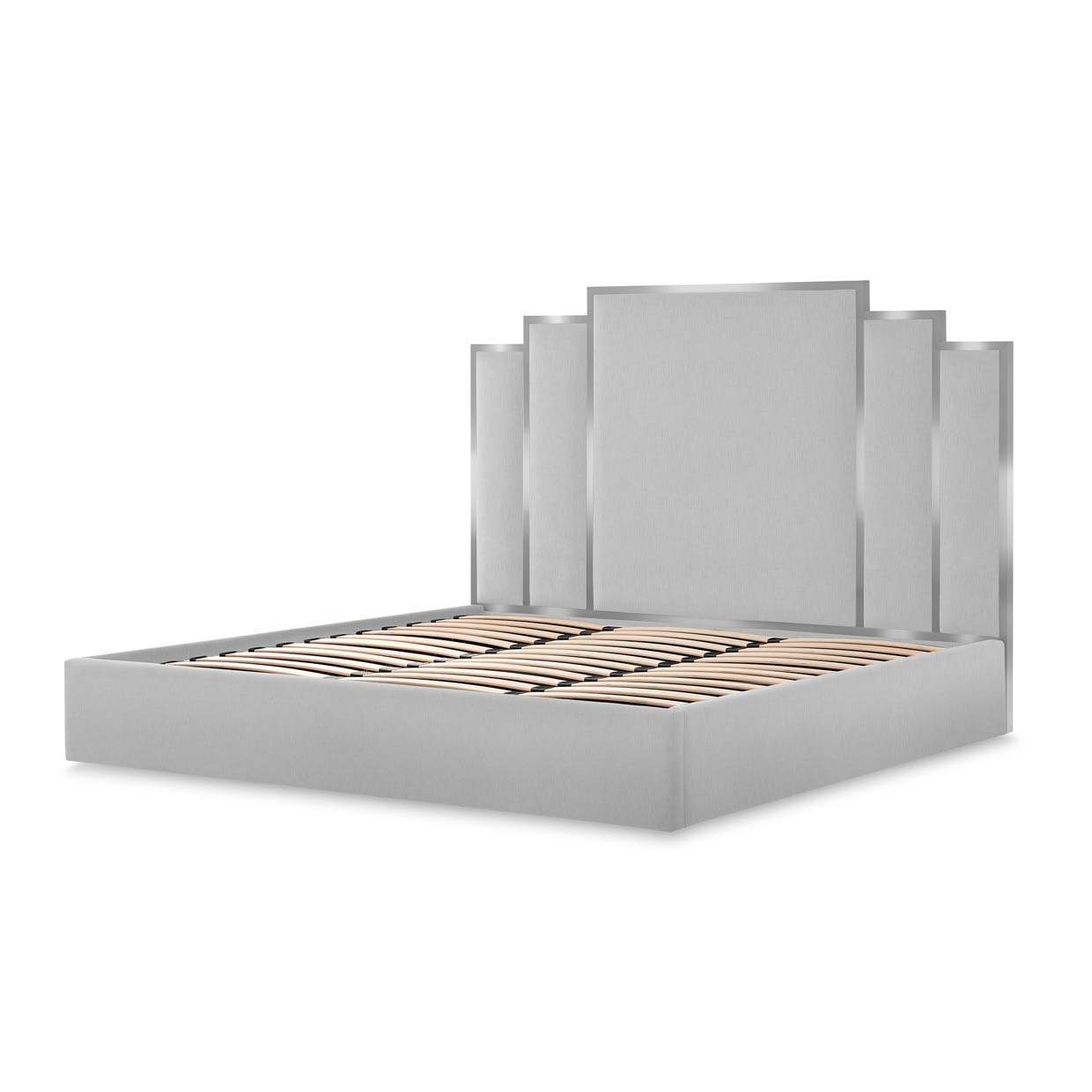 • Headboard with Chrome Accents: Features a stepped silhouette with vertical paneling, framed in sleek chrome metal for a subtle touch of modern glamour.