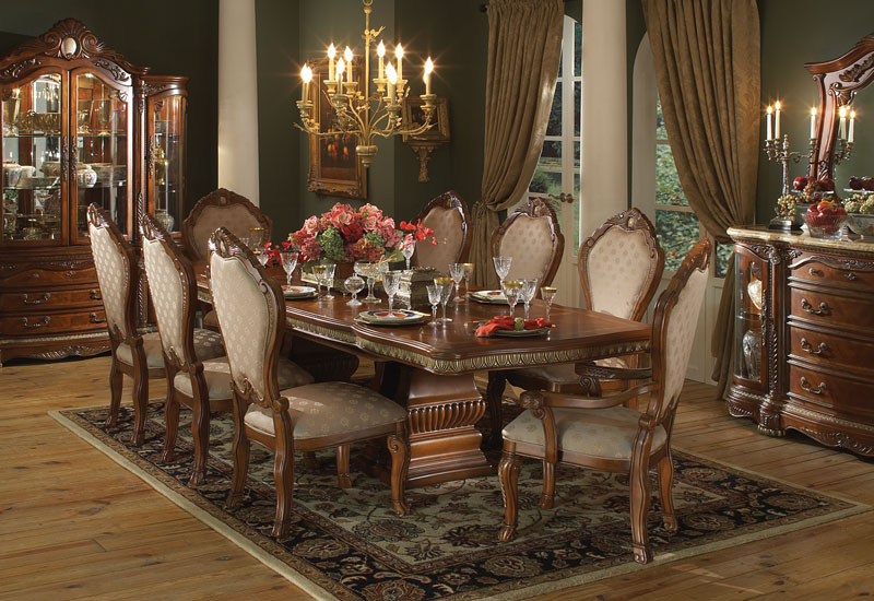 Every curve of the magnificent Cortina collection speaks of elegance. From the graceful lines of its deep carvings to the crowning feature of its marble cameo, every inch of Cortina exudes a stately presence. Sturdy metal footings, seeded glass, light chandeliers and marble elements enhance its kinetic appeal. Embraced in a Honey Walnut finish, Cortina is truly a work of art.