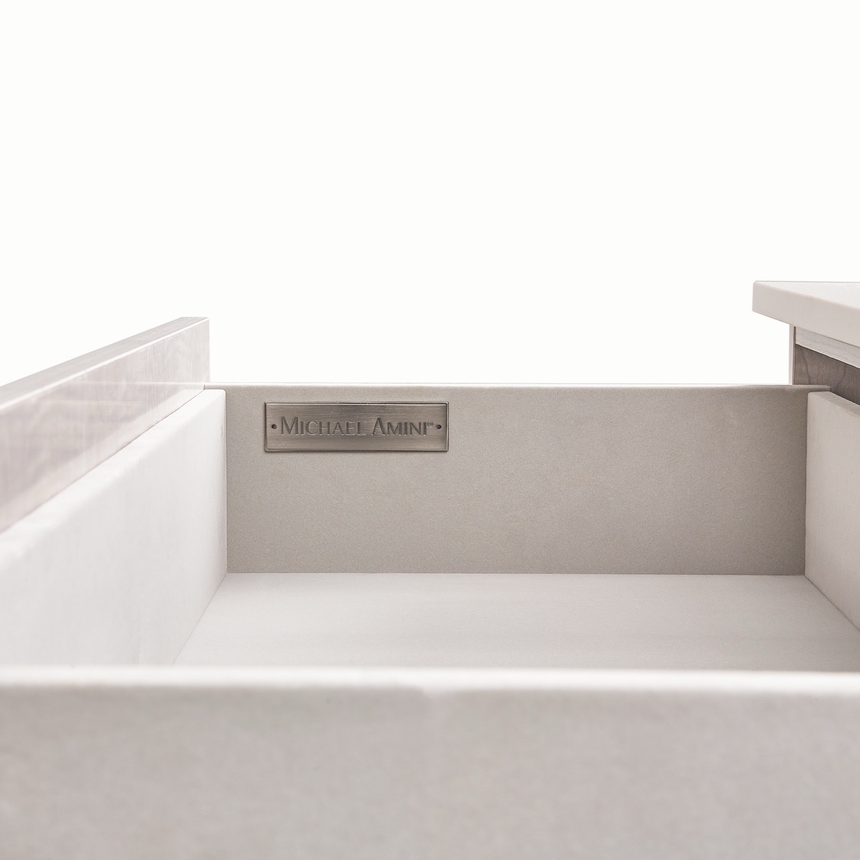 Create a serene space with the calming palette and clean lines of the Marin Collection. Its modern cabinets and drawers feature a unique non-hardware pull design that enhances the sleek profile. Finished in a soft greige blend and defined by a swirled maple motif in a glossy acrylic coat, each piece gains subtle depth, while cultured marble tops introduce a refined contrast.